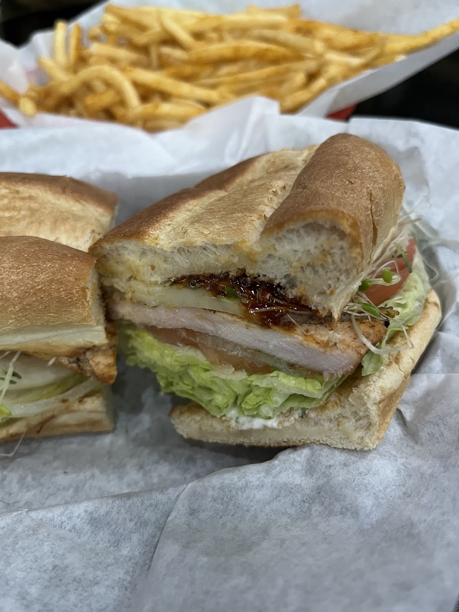 Tri-tip sandwich perfection. Generous amount of tri-tip, tender enough to bite through barbecue sauce is awesome. Their fries are generous also. Their service is great. Loud environment, but fun for events, because they have 1 million TVs.